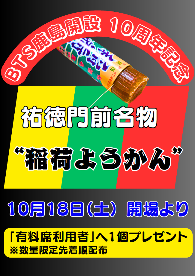 【10月18日(土)】BTS鹿島開設 10周年記念”稲荷ようかん”有料席利用者プレゼント
