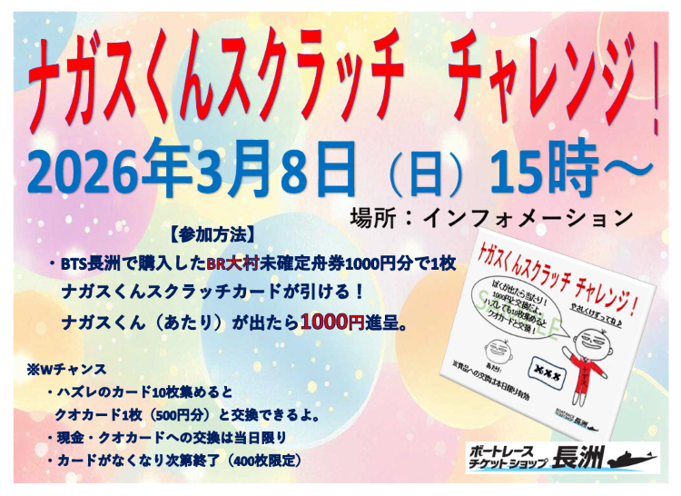 【3月8日(日)】海の王者決定戦ナガスくんスクラッチチャレンジ!