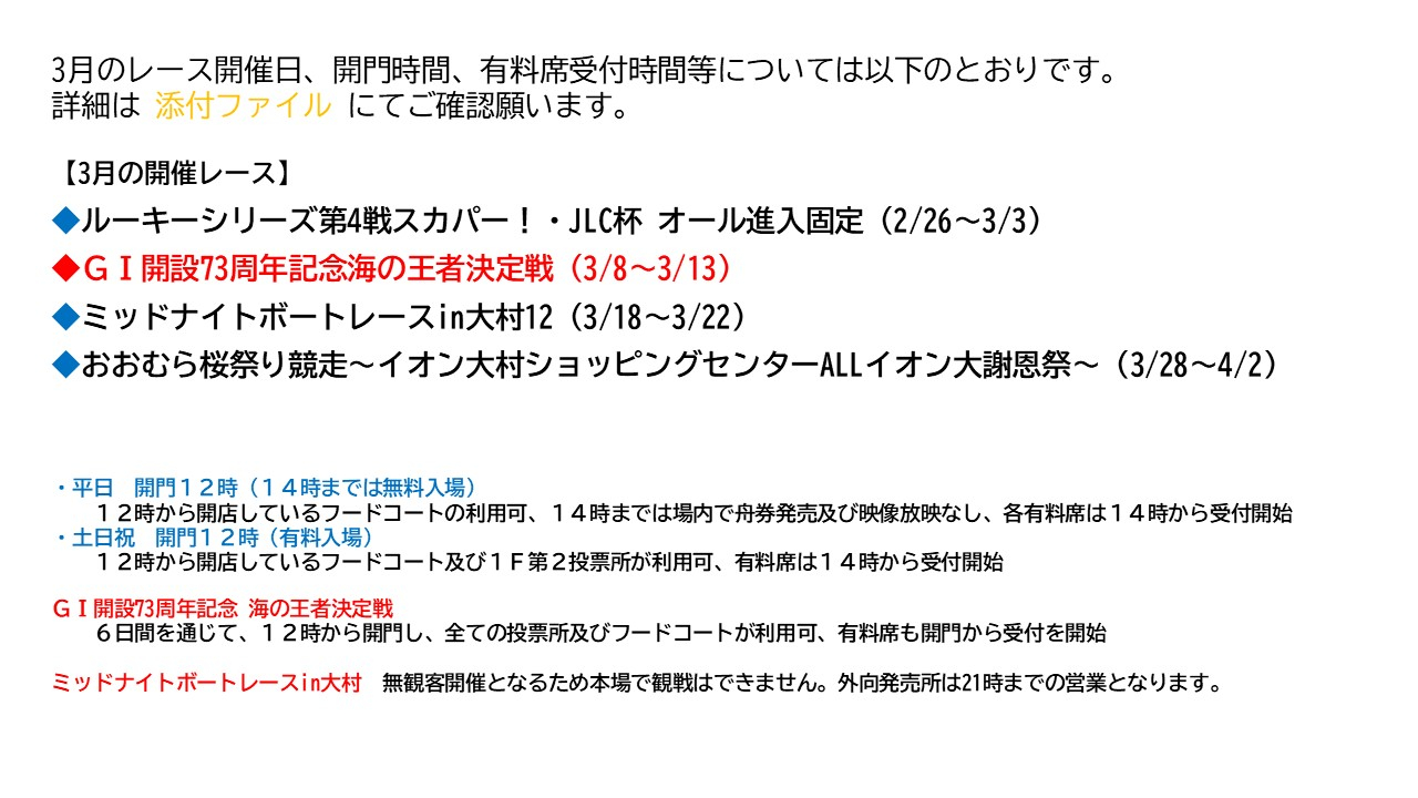 3月の本場開門時間等について