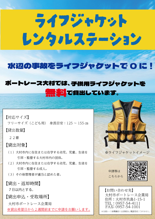 ボートレース大村では各学校及び団体がプールや海、川などで活動を実施する際に、参加する子供たちが安全に楽しく活動できるよう、ライフジャケットを無料で貸し出します。