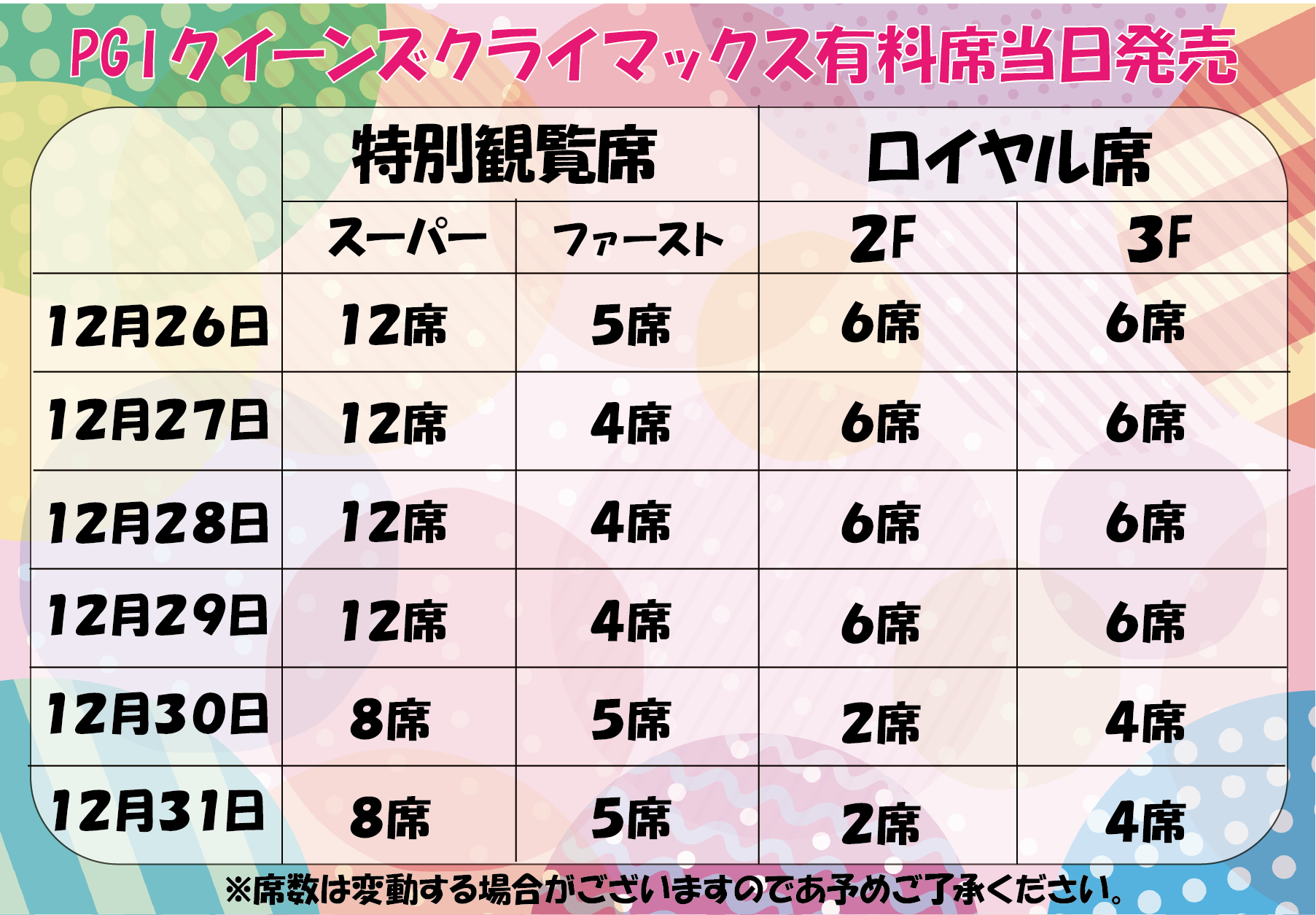 有料席の受付は整理券配布順で致しますので開門後は速やかに各有料席受付にお越しください。