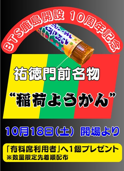 BTS鹿島開設10周年記念期間中の10/18に有料席ご利用のお客様に限り配布