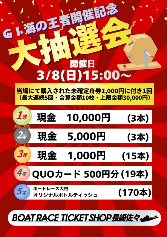 3/8~13日まで、大村にて開催される「GⅠ海の王者決定戦」開催を記念して、3/8日(日)15:00~ガラポン抽選会を開催致します。