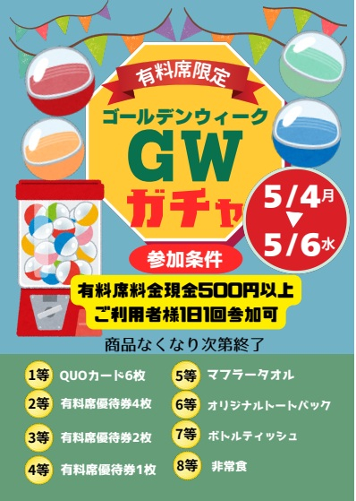 5月4日(月祝)~6日(水祝)期間中、有料席料金現金500円以上ご利用のお客様1日1回ガチャガチャにご参加いただけます。