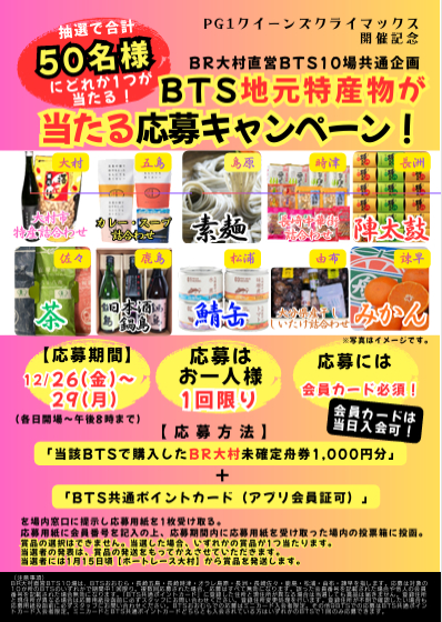 『PG1クイーンズクライマックス開催記念』として、 BOATRACE大村直営BTS地元特産物が当たる応募キャンペーンをおこないます。 皆様のご来場を心よりお待ちしております。