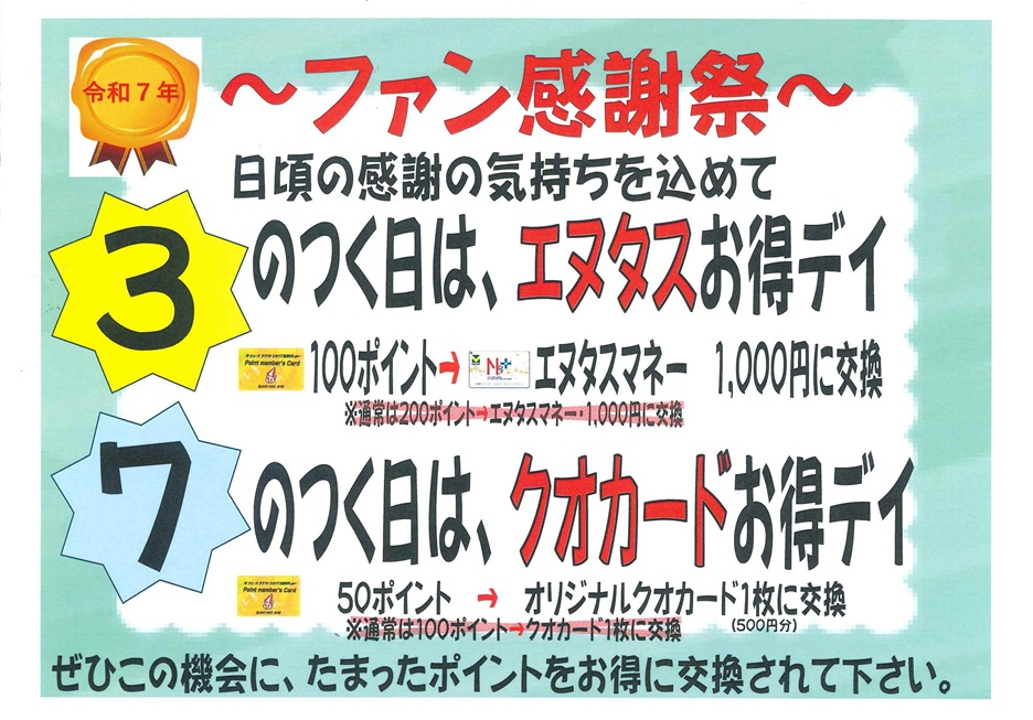 毎月3日・13日・23日・30日・31日はエヌタスお得デイ 毎月7日・17日・27日はクオカードお得デイ たまったポイントをお得に交換できます。 ご来場お待ちしております。