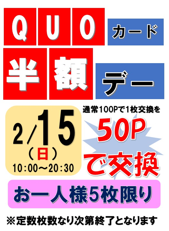 来る2月15日(日)10:00~20:30(定数枚数になり次第終了)QUOカード半額キャンペーンを実施致します。