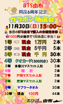 おかげさまで、BTS由布は11月で6周年を迎えることができました。 皆様への感謝の気持ちを込めて、ガラポン抽選会を開催致します。 どうぞお気軽にご参加ください。 皆様のご来場お待ちしております。